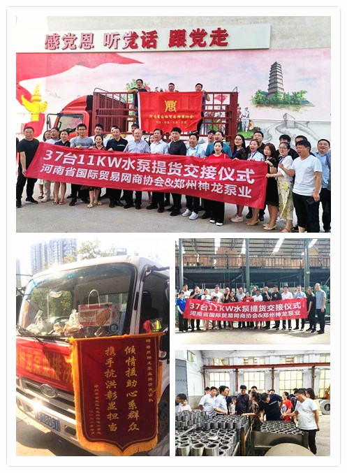 河南国际贸易网商协会、神龙泵业水泵提货交接,未来路街道赠神龙排涝突击队锦旗